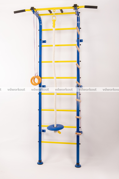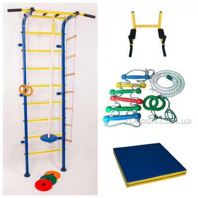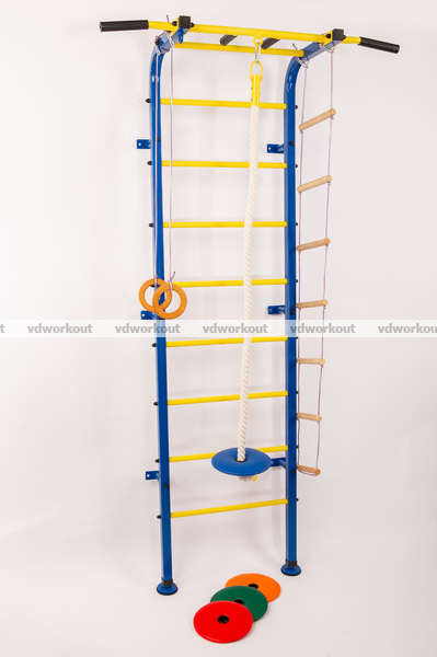 Детская шведская стенка Луна сосоит из металлические стойки 2 шт, металлические перекладины 9 шт, жёстко закреплённый турник с широким узким и узким параллельным хватом 1 шт, детский навесной набор (лестница, канат , наклейка ростомер, гимнастические кольца ), брусья для пресса и жима, гимнастический мат