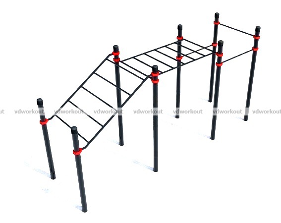 Комплекс состоит из восьми вертикальных опорных столбов и трёх перекладин. Высота опорных столбов: 6 шт – 2600 мм, 2 шт – 2000 мм. Три перекладины длиной 1200 мм каждая, крепятся к опорным столбам при помощи хомутов. Высота фиксации турников: 1 шт – 2300 мм, 1 шт – 2100 мм, 1 шт – 1800 мм. Рукоход состоит из двух секций (классическая и в подъём) и крепится на разной высоте 1600 мм и 2600 мм при помощи хомутов. Длина классической секции 1900 мм, длина секции в подъём 1790 мм. У рукохода в подъём конечные части изогнуты под углом 45 градусов, высота подъёма 1000 мм, длина подъёма 1930 мм. Шаг перекладин рукохода 300 мм. Высота подъёма от 1850 мм до 2850 мм от поверхности резинового основания. Диаметр перекладин 32 мм. Толщина стенки 3,5 мм. Длина комплекса не более 5100 мм. Максимальная ширина комплекса 1500 мм.