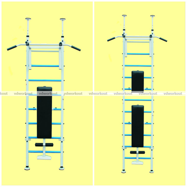 Шведская стенка с металлическими перекладинами, распор пол-потолок и крепление к стене, турник-брусья с широким хватом съемные, скамья для пресса с валиками.