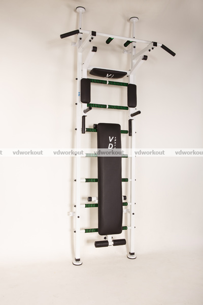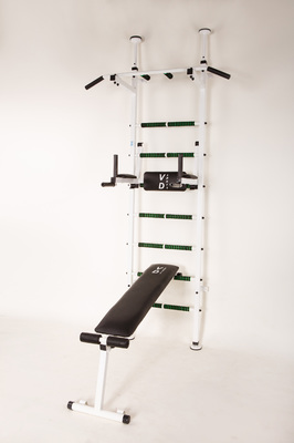 Шведская стенка состоит из 2-х. стоек, 7 ми ступенчатая с неопреновыми накладками. Жёстко закреплённый турник, турник с широким и параллельным хватом. 4 крепления к стене +распор пол-потолок. Скамья для пресса и жима. Турник — брусья с держателем под штангу.