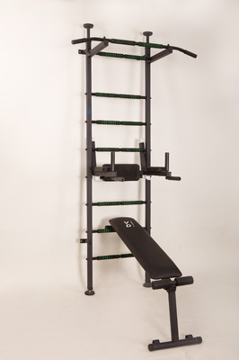 Шведская стенка с металлическими перекладинами с поролоновыми накладками, распор пол-потолок и крепление к стене, турник с широким хватом, брусья с подставкой под штангу, скамья для пресса. Цвет белый глянцевый, черный матовый. с полиуретановыми подлокотниками и спинкой