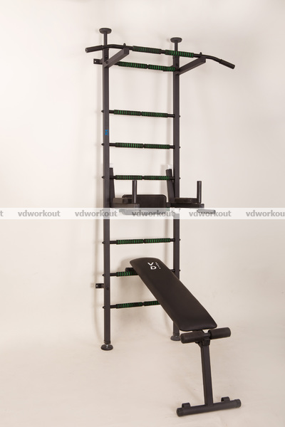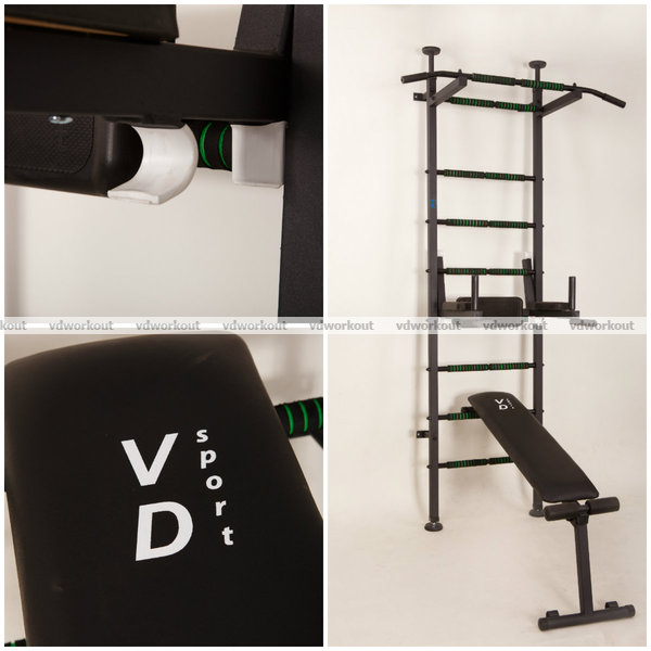 Отличительной чертой шведской стенки «VD Energy Pro» является наличие мягких деталей (грипсов), что предотвращает скольжение по ним и делает удобной тренировку. Подлокотники и спинка на брусьях изготовлены из полиуретана, а также лавка для пресса и жима.