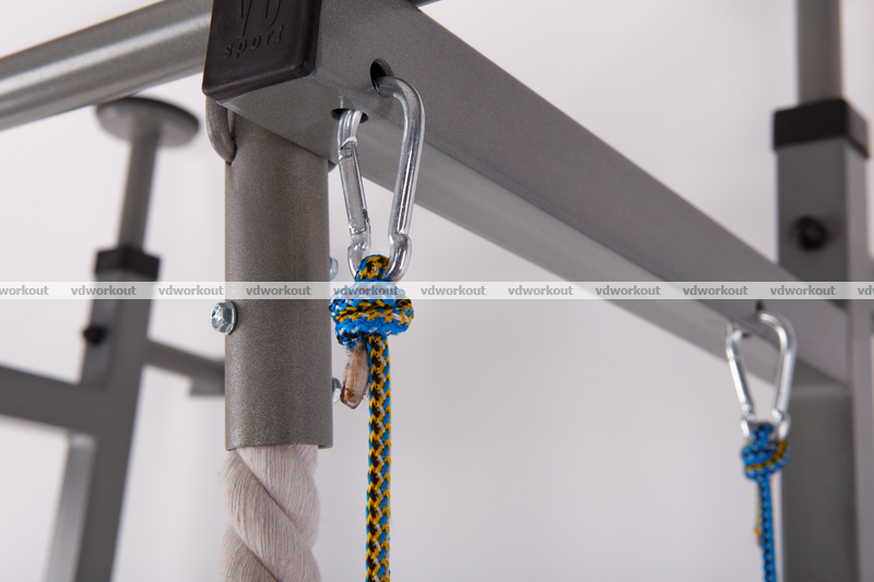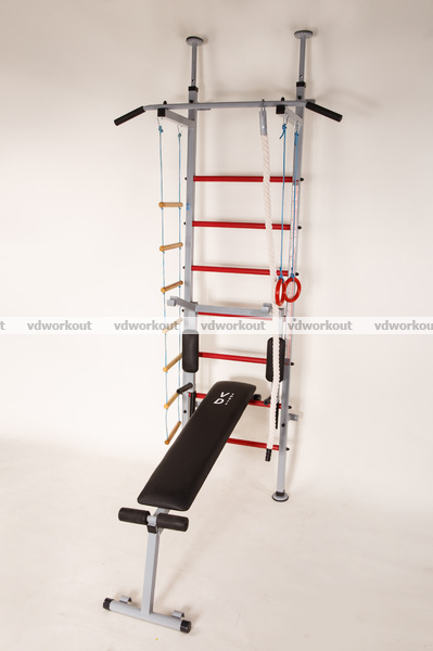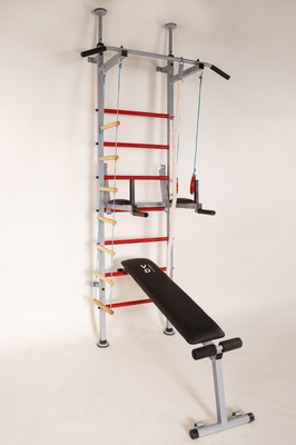 Шведская стенка выполнена в новом глянцево-сером цвете. Комплектация: шведская лестница с металлическими перкладинами, одетые в красный пластик, приваренный турник, съемные брусья с подставкой под штангу , съемная складываемая скамья для пресса и жима (может использоваться как наклонная скамья для пресса и как силовая скамья для жима) детский навесной набор (канат, веревочная лестница, гимнастические кольца)