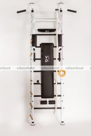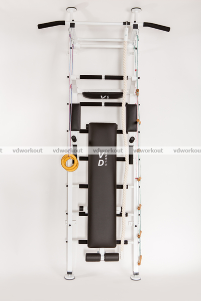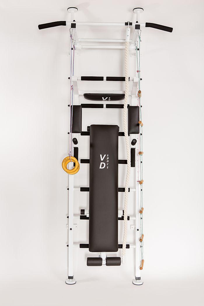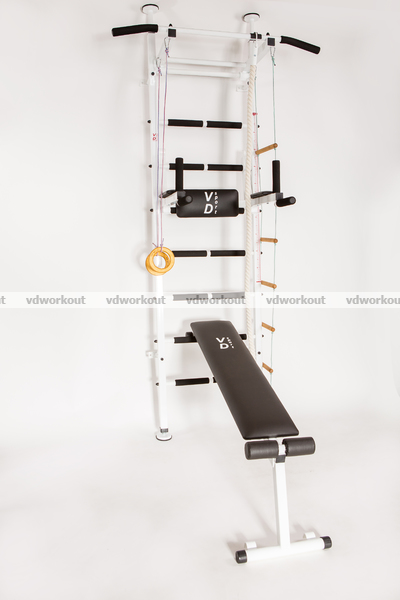 Шведская стенка с металлическими перекладинами, распор пол-потолок и крепление к стене, турник-брусья с широким хватом съемные, скамья для пресса с валиками. Цвет белый глянцевый.