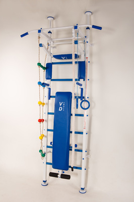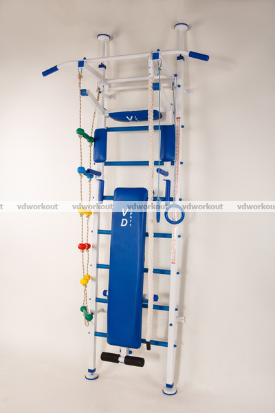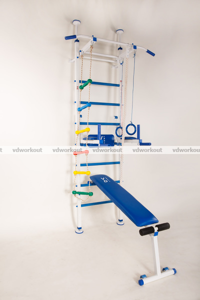 Уникальность шведской стенки — это не обычный дизайн, цветовая гамма, жёстко закреплённый переставной турник, все крючки на брусьях и лавке обработаны термоусадкой (что представляет собой надёжность и практичность, защищая детали конструкции от царапин и повреждений).