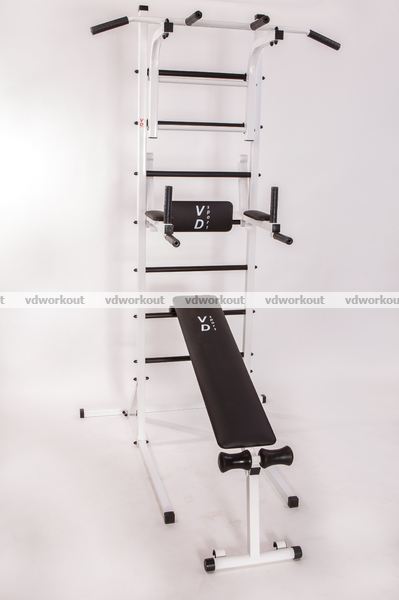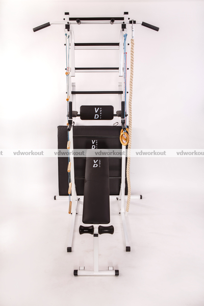 Шведская стенка Спорт Зона Универсал- максимальная функциональность. Отличием и преимуществом данной модели есть функциональный ,усиленный переставной турник, на турнике имеются дополнительные ручки для узкого параллельного хвата. В комплектации шведской стенки Спорт Зона Универсал входит скамья для пресса и жима, брусья переставные с держателем под штангу, которые удобно перемещать на любую высоту шведской стенки.