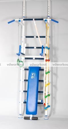 Максимальная функциональность, интересный дизайн, качество материалов и исполнения делают спортивную стенку Teenager одним из самых интересных предложений на рынке шведских стенок Украины. Заниматься на шведской стенке стало удобнее и комфортнее благодаря прорезиненным ручкам на перекладинах шведской лестницы и турнике, Комбинация белого и синего цвета - призывают к упорству, настойчивости и постоянству.