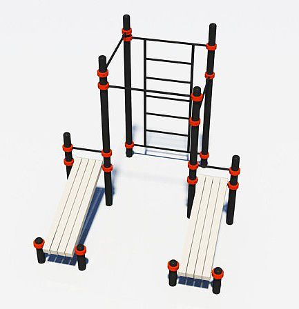 Комплекс состоит из десяти вертикальных опорных столбов высотой: 3 шт – 2600 мм, 1 шт – 2300 мм, 1 шт – 1400 мм, 1 шт – 1100 мм, 4 шт – 300 мм. К столбам высотой 2600 мм при помощи хомутов крепится шведская стенка с шагом перекладин 340 мм, шириной 1200 мм, высотой 2000 мм. Три перекладины для подтягиваний длиной 1200 мм крепятся между столбами 2600–2600 мм, 2600–2300 мм, 2300–2600 мм. В комплекс входят две скамьи для упражнений на пресс с разным наклоном, которые крепятся к опорным столбам 2600–1400 мм, 300–300 мм и 2300–1100 мм, 300–300 мм соответственно при помощи хомутов и перекладин длиной 500 мм.