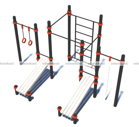 Комплекс состоит из двенадцати вертикальных опорных столбов высотой: 8 шт – 2600 мм, 4 шт – 300 мм. К столбам высотой 2600 мм при помощи хомутов крепится шведская стенка с шагом перекладин 340 мм, шириной 1200 мм, высотой 2000 мм. Три перекладины для подтягиваний длиной 1200 мм крепятся между столбами на высотах 1900 мм, 2100 мм и 2400 мм. В комплекс входят две наклонные скамьи для упражнений на пресс, которые крепятся к опорным столбам при помощи хомутов и перекладин длиной 500 мм. В комплекс также входят кольца и канат, расположенные симметрично от скамеек для пресса. Кольца и канат крепятся к перекладинам длиной 1200 мм.