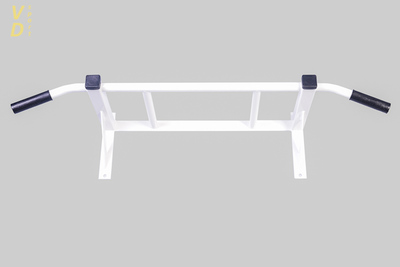 Турник настенный, широий хват, узкий паралельный хват. Усиленная конструкция. Цвет белый, пластмассовые ручки. Вынос от стены - 300 мм, высота - 250 мм, длина - 1100 мм. Диаметр перекладины - 27 мм. Конструкция турника цельносварная, покраска порошковая. Допустимая нагрузка - 120 кг.