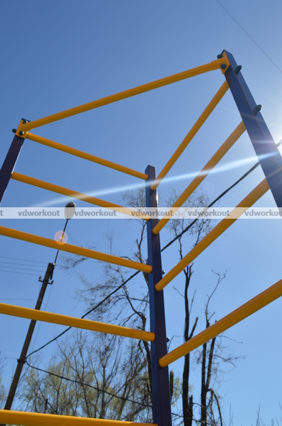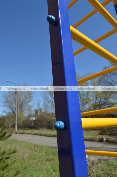Спортивная стенка для улицы "Лаз-Уголок"- произведена в классическом исполнении, Две вертикальные лесенки и турник перекладина является результатом расширения модефикации стандартной двойной шведской стенки. За счет объединения в одну конструкцию двух вертикальных лестниц и перекладины -турник, появилась возможность для одновременных занятий 2 или 3 человек.