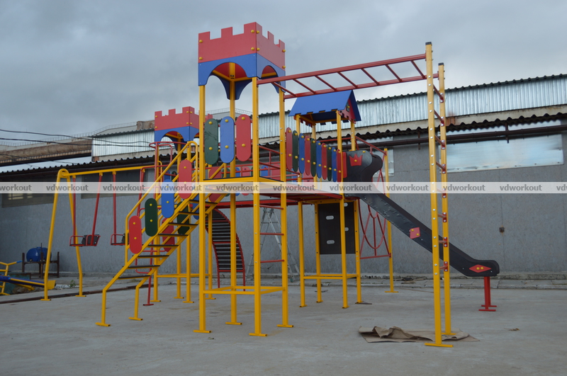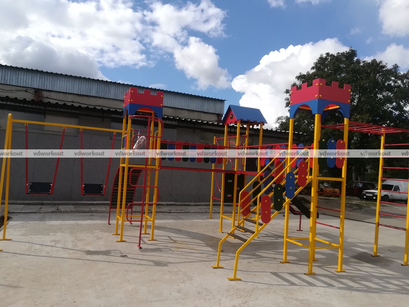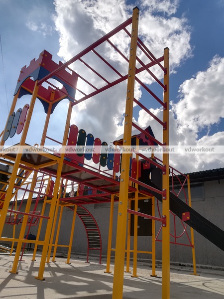 Уличный спортивный комплекс состоит из - 3 башни, мостики переходы, сетка паутина, качеля металлическая двух местная, горка, винтовой спуск, мостик для лазания, лестница, детский канат для подтягивания. Спортивный комплекс изготовлен из профильной трубы, влагостойкой ламинированной цветной фанеры, горка выполнена из нержавейки, все болтовые соединения защищенный колпачками. В спортивно игровом комплексе Плей Граунд -6 предусмотрены те игровые элементы, которые удовлетворят Ваших непосед.